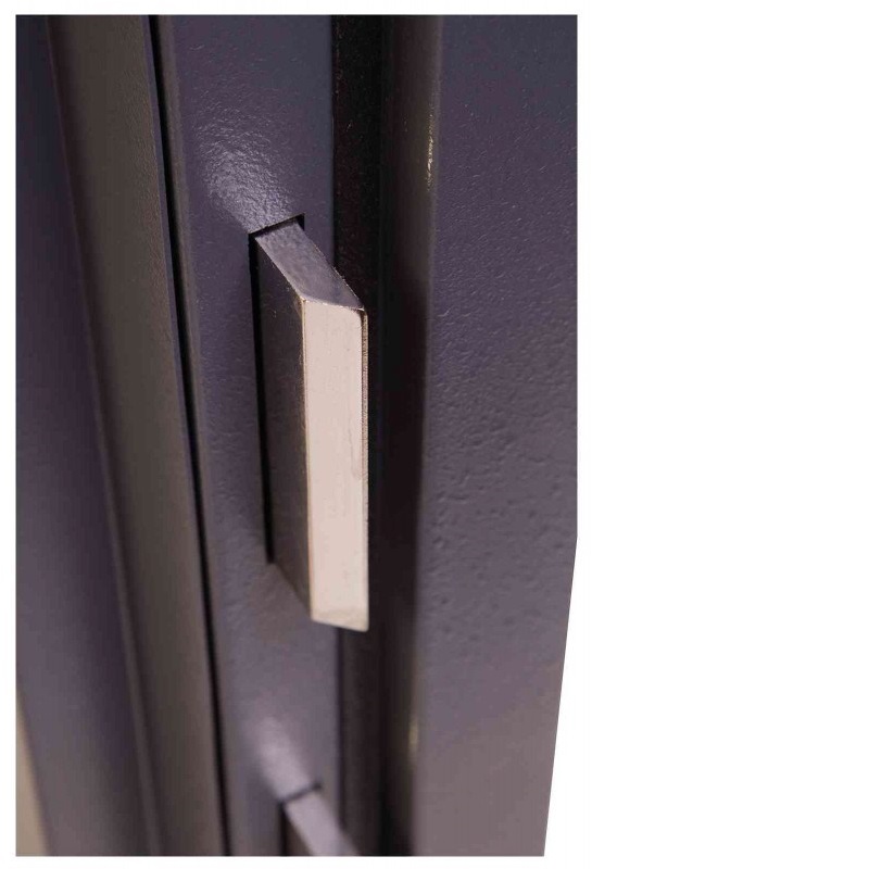 - Сейф HS3551E оборудуется четырёхсторонним ригельным механизмом, представленным четырьмя прямоугольными стальными ригелями 100×10 мм – выдвигающимися с трёх сторон, а также пассивными (неподвижными) со стороны петель.