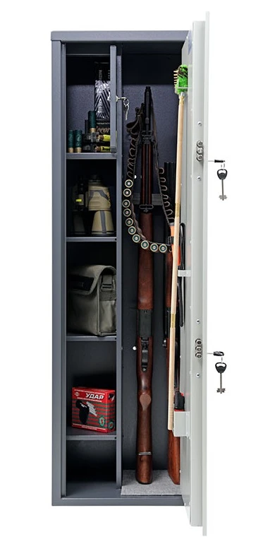 - Сейф делится на две секции: одна оборудована ложементами, во второй расположен трейзер (запирающееся на ключ отделение для патронов размерами 220×180×178 мм) и три съёмные полки.