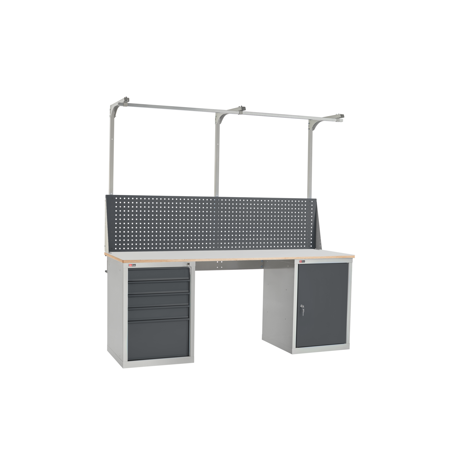 При желании комплектацию верстака можно дополнить перфорированным экраном, светодиодным комплектом освещения, дополнительными аксессуарами или выбрать другой тип столешницы: