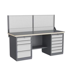 - Рабочее место комплектуется перфорированным экраном, на котором удобно размещать держатели для инструментов, полки и другие навесные элементы, благодаря чему весь необходимый инвентарь всегда будет на виду.